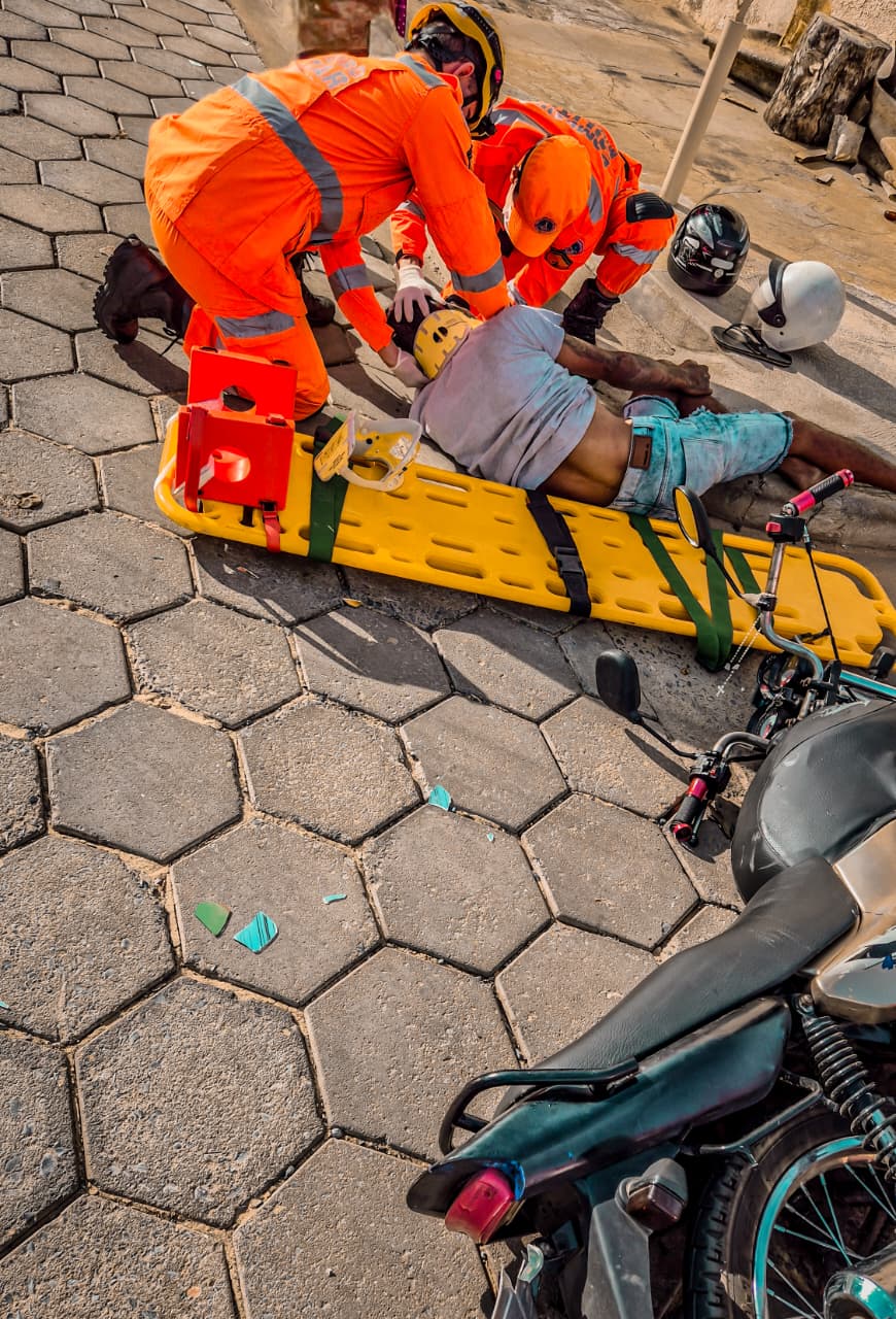 O condutor da motocicleta Yamaha YBR 125, identificado pelas iniciais J.A.B., de 28 anos, encontrava-se caído ao solo em decúbito lateral esquerdo, queixando-se de dor na região lombar, além de apresentar ferimento com sangramento no lábio superior. A passageira da mesma motocicleta, P.P.C., de 26 anos, apresentava edema e dor no tornozelo e pé direitos, sendo encontrada deambulando pelo local.